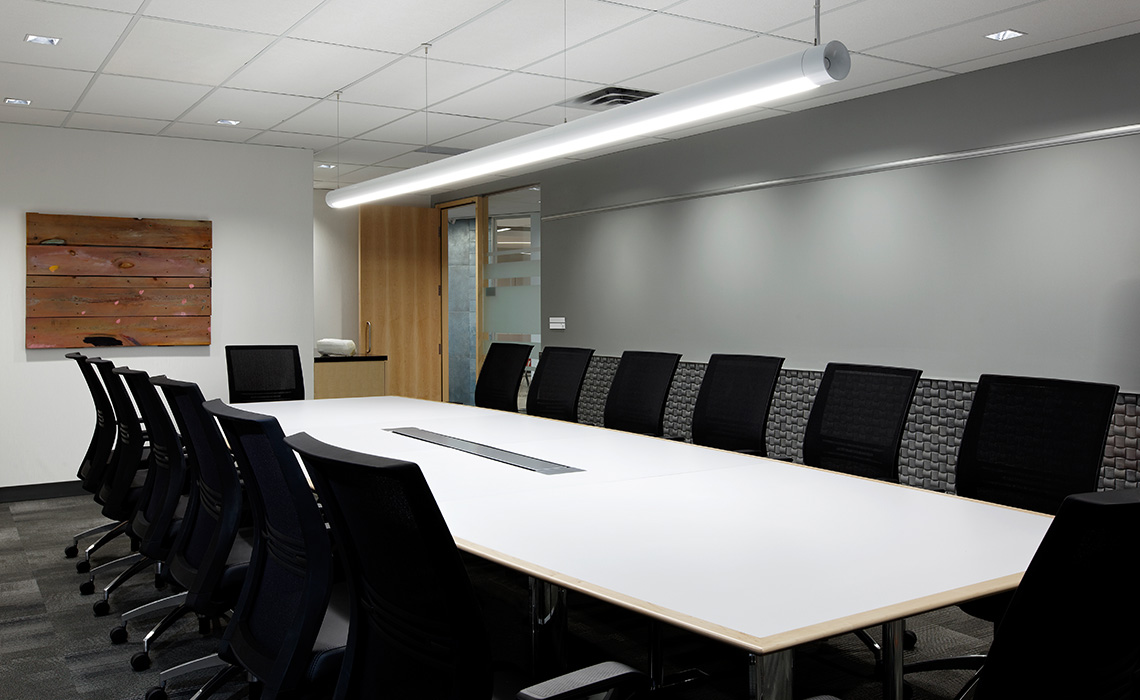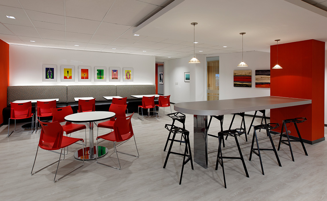 The lifeblood of creativity is a free-flow of ideas. Low partitions as well as a collaborative pod configuration, allows those next to you, as well as those on the other side of the room, to informally gather throughout the space. This configuration is substantially more efficient than formal meeting rooms because the gatherings can be serendipitous, flexible in size and close to individual technology and project resources. There are also formal meeting rooms, one seating up to 20, as external project teams can be large. An oversized lunchroom/cafe doubles as an amenity and a less formal meeting space ideal for full staff functions.