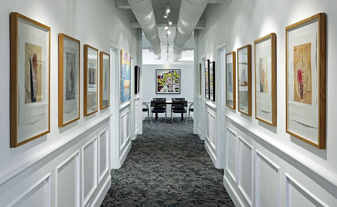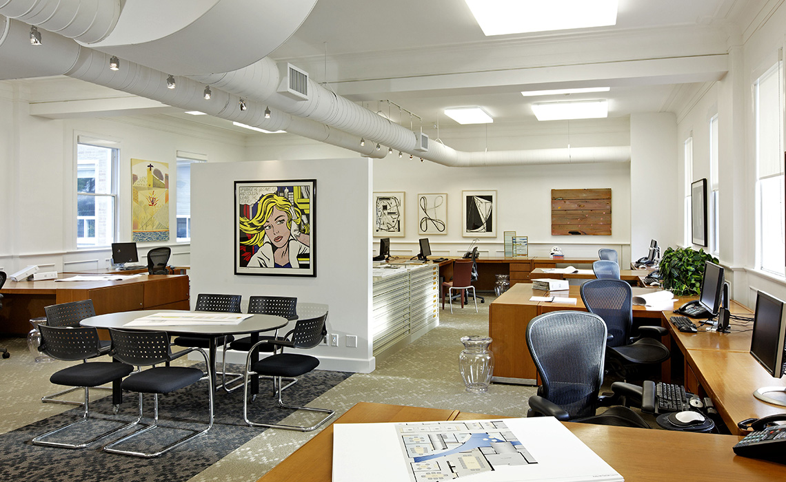 The ground floor hosted reception, of course, plus a large and small meeting room and lavish gathering space between the two with built-in hospitality infrastructure. Further into the ground floor were ten additional work stations and a partner's office. The basement included a kitchen, staff lounge area, resource library, three sample rooms, computer server and a large archival storage room.